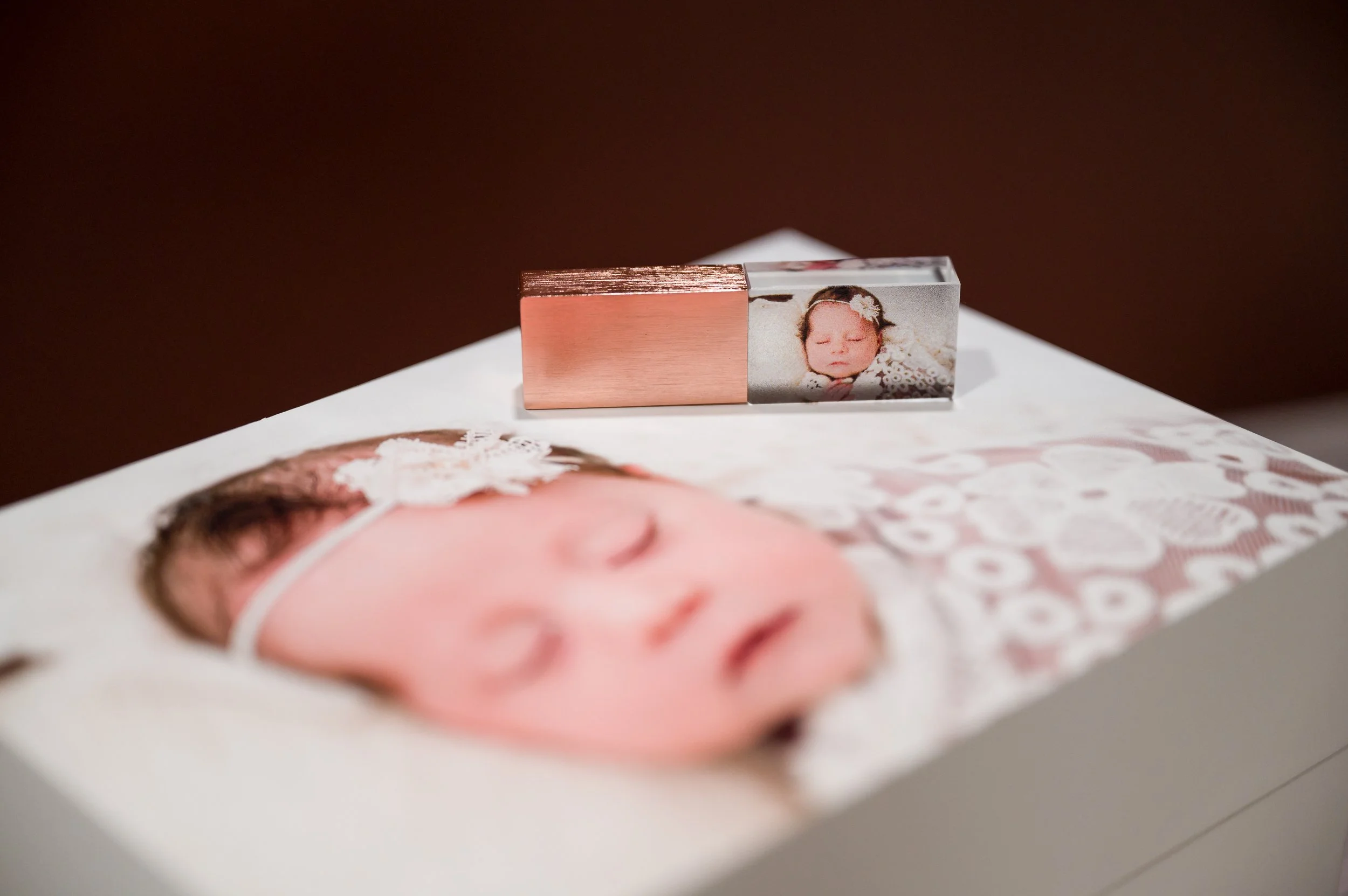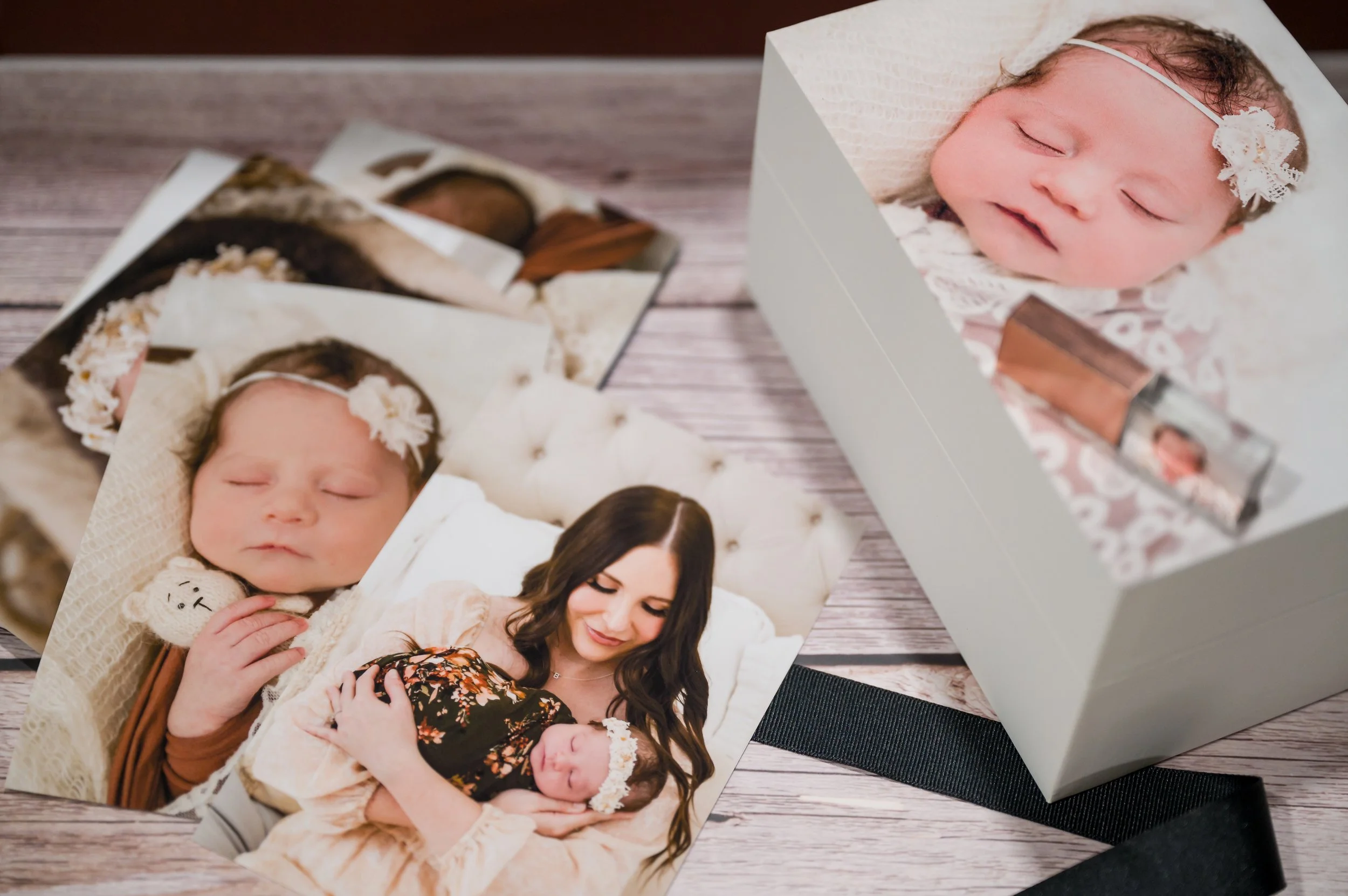 Every In Home Newborn Session includes 20 fully re-touched images that are printed as 4x6 deep matte prints and placed in a personalized keepsake photobox.